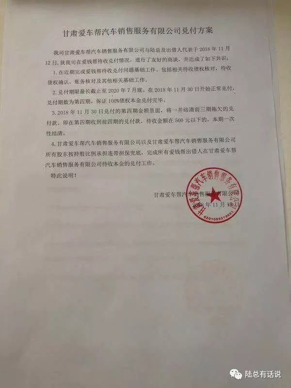 2.甘肃爱车帮张总公布盖章后的兑付方案文档。李律师会安排时间找甘肃爱车帮股东面签文档内容。