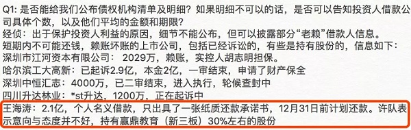 好歹是个上市公司,王先生必然拥有一个法务团队或律师,认准了其欠款的形式及欠款主体。即欠款主体不是赢鼎教育,而是王海涛个人。所以王先生巧妙地运用了这一点,将针对其公司的攻击,在法理上认为诽谤。