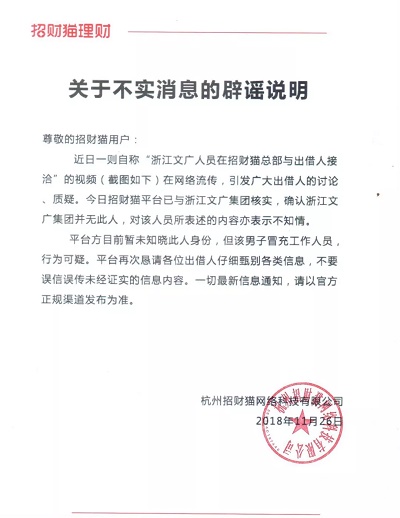 招财猫理财 2018.11.26-16:28……关于不实消息的辟谣说明