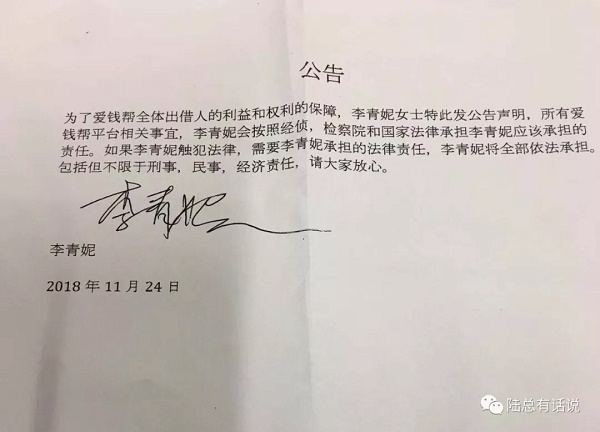 1.上周六(2018.11.24)李(青妮)总出差回来后,到兰台律所面签了关于爱钱帮的公告声明,声明文档如下图。