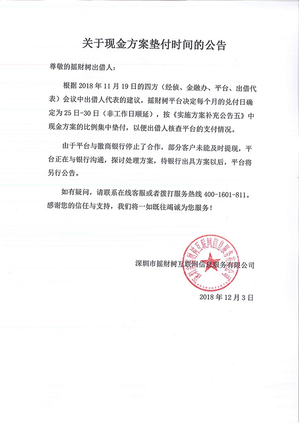 摇财树 2018.12.3-17:59……关于现金方案垫付时间的公告