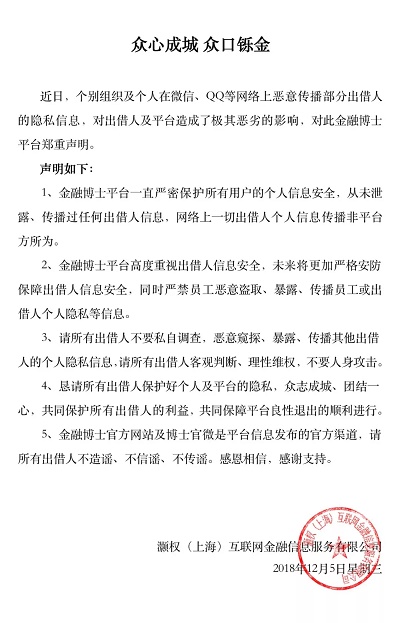金融博士 2018.12.5-12:00……众心成城,众口铄金……出借人信息泄露之谜