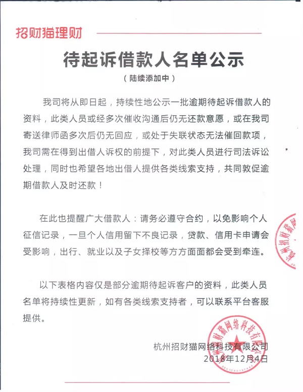 近日,平台为了更好的进行资产清收,协助上级部门共同打击“恶意逃废债”行为,保障全体出借人的利益,决定向广大用户公布一批逾期待起诉出借人名单。