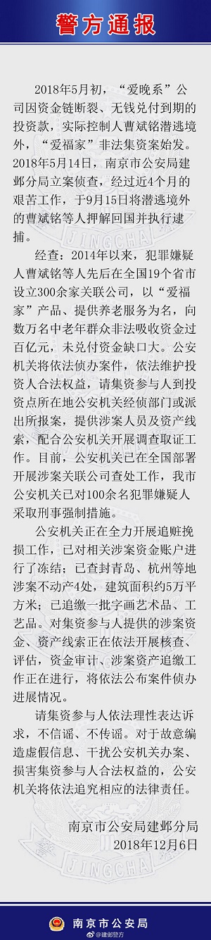 2018年5月初,“爱晚系”公司因资金链断裂、无钱兑付到期的投资款,实际控制人曹斌铭潜逃境外,“爱福家”非法集资案始发。2018年5月14日,南京市公安局建邺分局立案侦查,经过近4个月的艰苦工作,于9月15日将潜逃境外的曹斌铭等人押解回国并执行逮捕。
