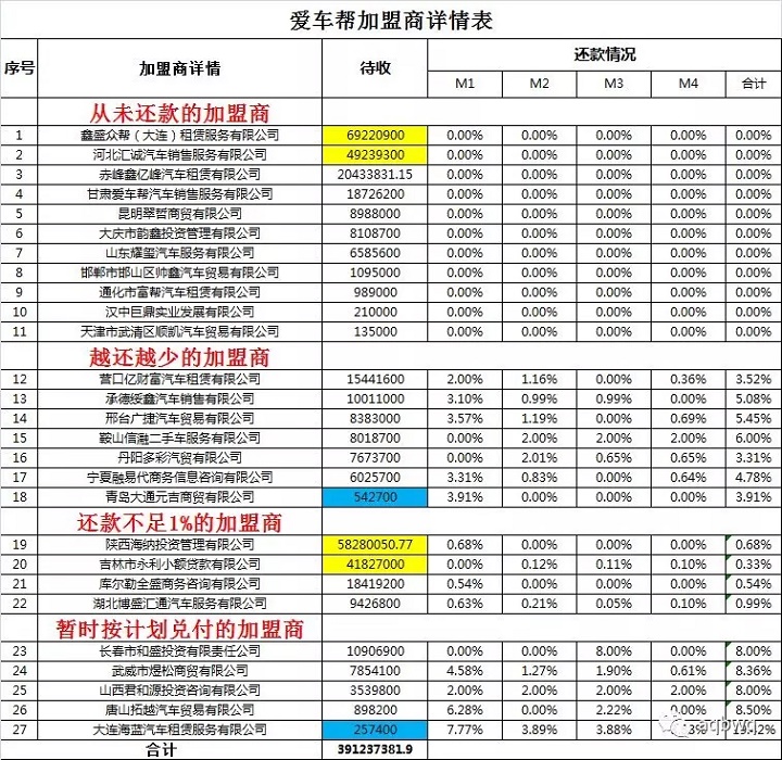 【写在最后】上表清晰的展示了车帮加盟商们的老赖嘴脸!标黄的是车帮待收金额最大的四大加盟商,也是出借人最多的重灾区,希望在接下来活动中,无论您是否有此加盟商的债权,都能配合到本地的活动中。