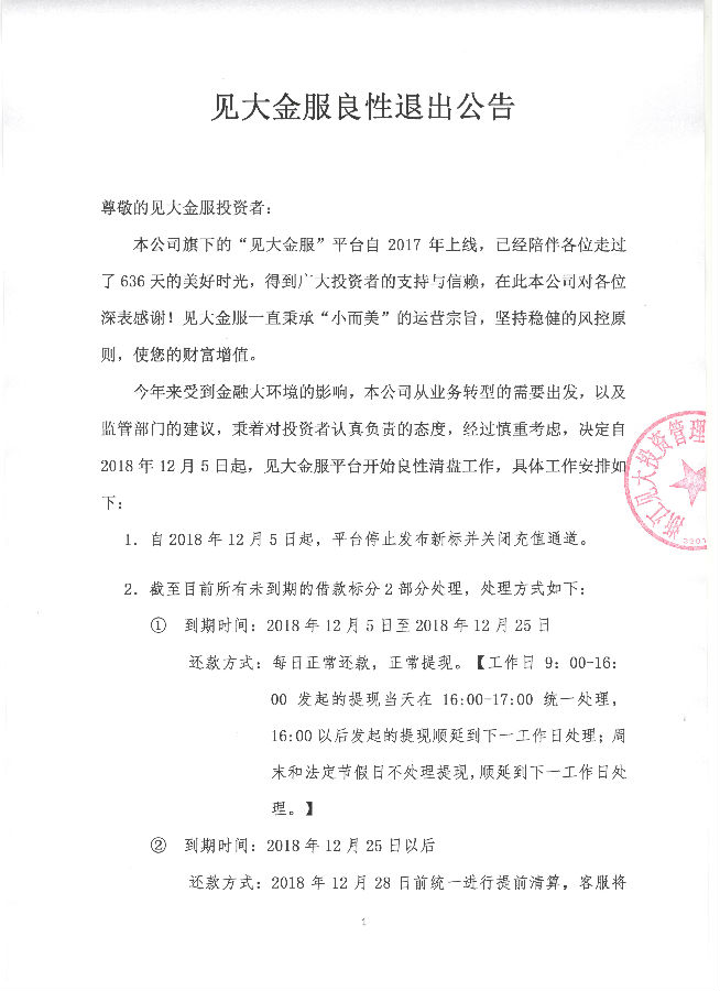 见大金服 2018.12.4-16:28……平台从业务转型的需要出发,以及监管部门的建议,决定自2018年12月5日起开始良性清盘工作……自2018年12月5日起停止发布新标并关闭充值通道。截至目前所有未到期的借款标分两部分处理,处理方式如下:1、到期时间: 2018年12月5日至2018年12月25日,还款方式:每日正常还款,正常提现。工作日9:00-16:00发起的提现在当天16:00 -17:00统一处理,16:00以后发起的提现顺延到下一工作日处理;周末和法定节假日不处理提现,顺延到下一工作日处理……2、到期时间: 2018年12月25日以后,还款方式: 2018年12月28日前统一进行提前清算,客服将与每个未到期的投资人沟通提前清算明细,协助操作提前提现……所有借款标的将在2018年12月28日前全部清算完毕