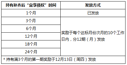 持有补齐“宜享债权”奖励发放方式:现金红包奖励发放方式调整为每期达标后分期(12月)发放,见下表: