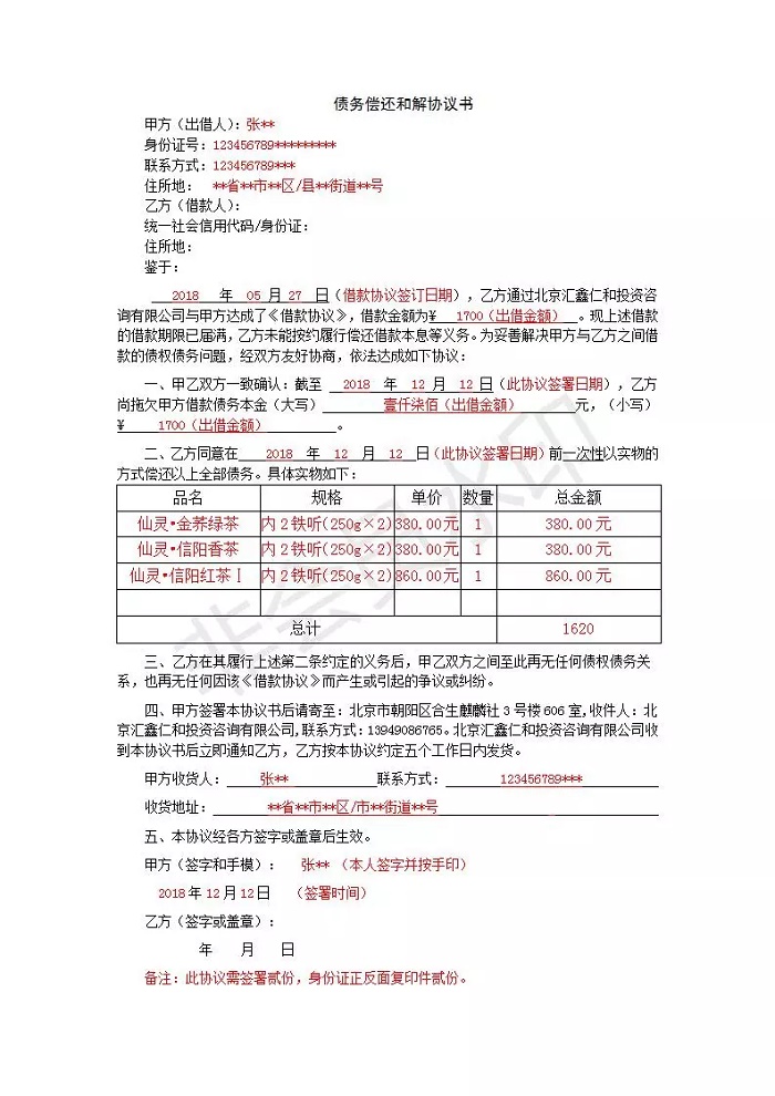3、需签订《债务偿还和解协议书》下载地址:https://pan.baidu.com/s/1AxZH_kgZv_P-VBhFq67e6Q ,出借人签署寄回该协议后,借款人邮寄实物。