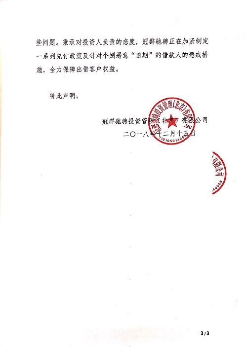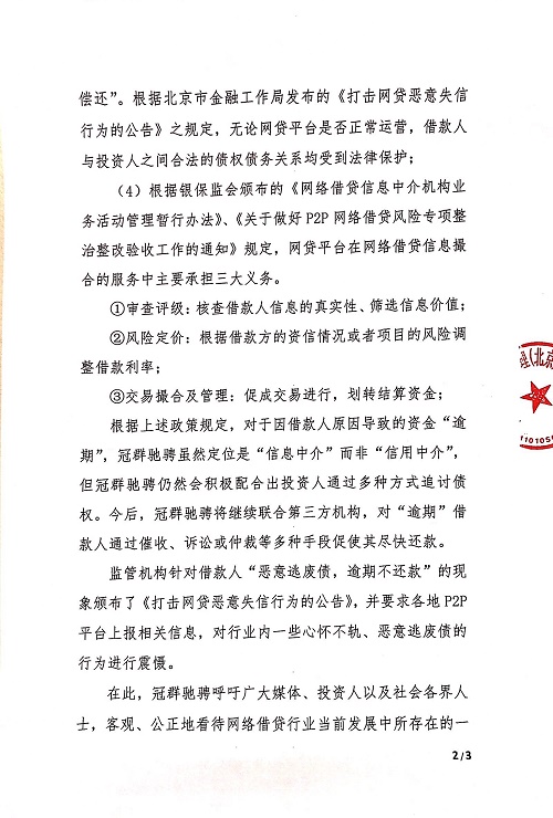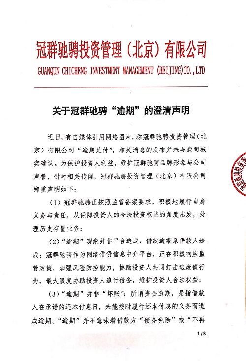 冠群驰骋 2018.12.13-18:58……关于冠群驰骋“逾期”的澄清声明……冠群驰骋强调,根据相关政策规定,对于因借款人原因导致的资金“逾期”,冠群驰骋虽然定位是“信息中介”而非“信用中介”,但冠群驰骋仍然会积极配合出投资人通过多种方式追讨债权。今后,冠群驰骋将继续联合第三方机构,对“逾期”借款人通过催收、诉讼或仲裁等多种手段促使其尽快还款……冠群驰骋还称,其正在加紧制定一系列兑付政策及针对个别恶意“逾期”的借款人的惩戒措施