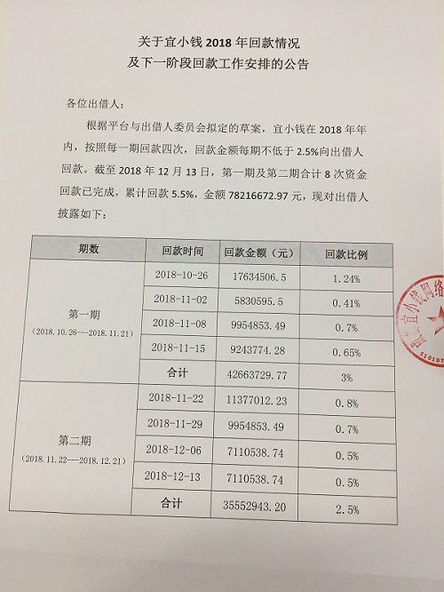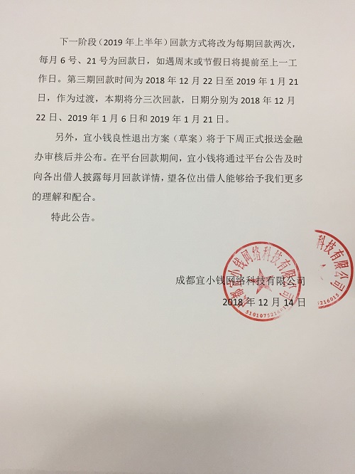 宜小钱(易小钱) 2018.12.14-17:49……关于宜小钱2018年回款情况以及下一阶段回款工作安排的公告