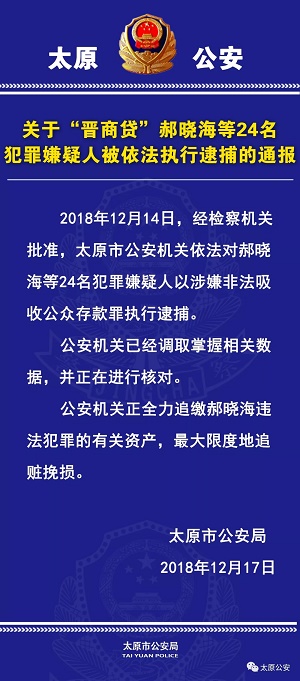 晋商贷 2018.12.17-16:44……关于“晋商贷”郝晓海等24名犯罪嫌疑人被依法执行逮捕的通报