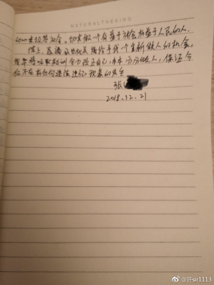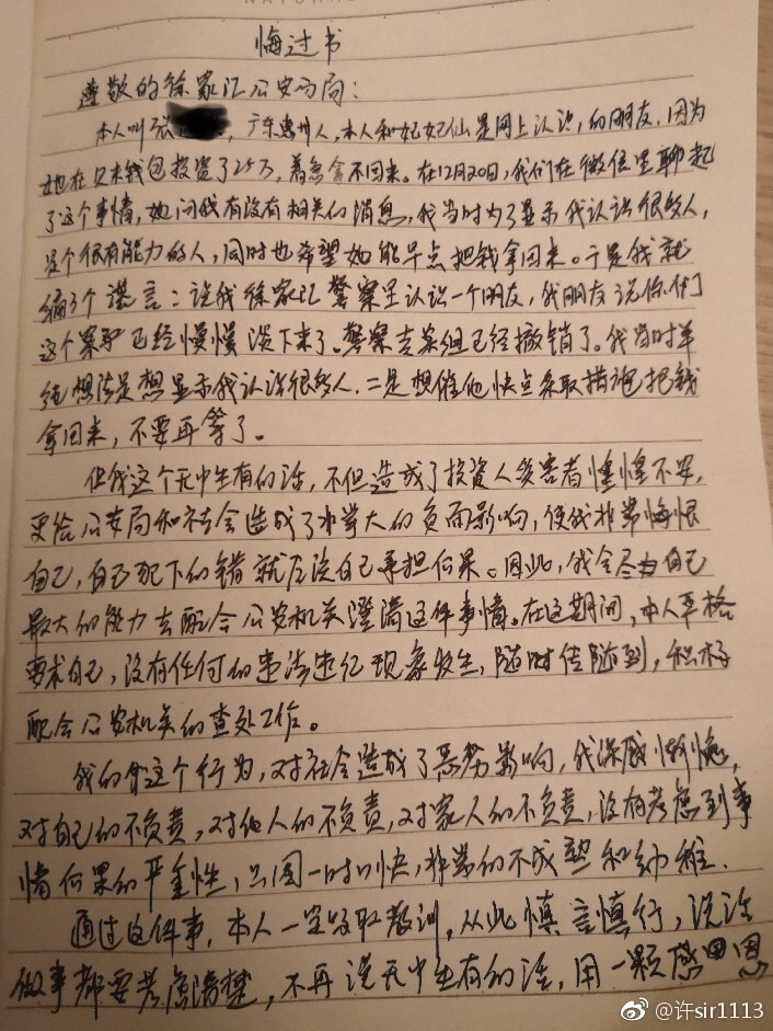 随后的剧情大家也都从许队微博里看到了,这位造谣的广东的非投资人张先生在许队的督促下,手写了一份悔过书。
