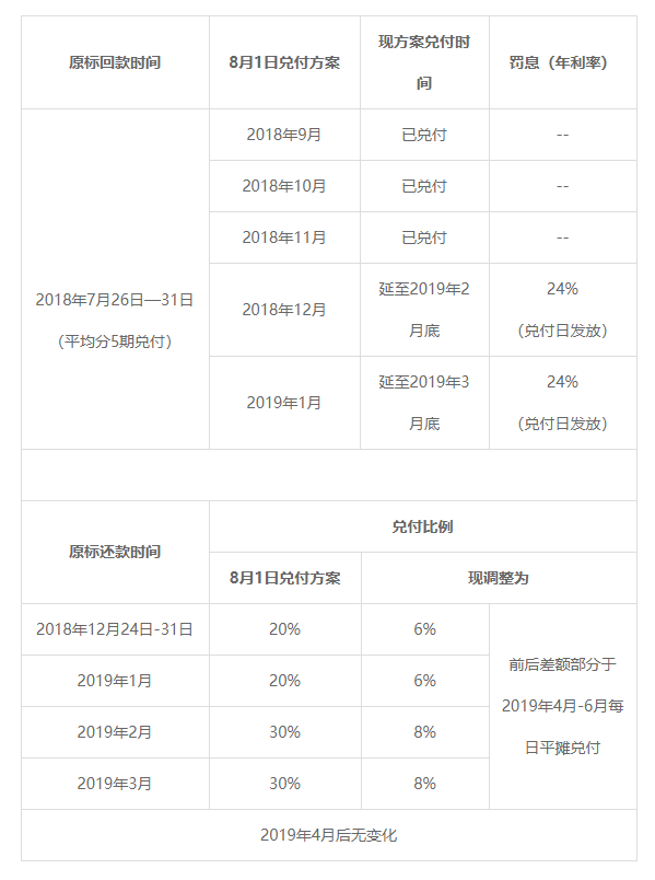 受大环境及年关春节淡季双重因素叠加影响,2019年一季度回款状况出现好转概率较小,为保障债权兑付持续顺利完成,经与出借人委员会两天的反复沟通,在有效保障广大出借人基本利益的前提下,现决定对原兑付方案中涉及2018年12月24日至2019年3月31日的阶段兑付比例作以下调整:
