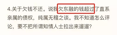 这一点我没有说过,我的原话是,你如果想代表债权人,那请你起码先把你“直系亲属”的债权给收了,再来说话。或者你可以用还欠别人的钱把支持你的债权人债权收一点,说话也能站得住脚。你现在光是站在那里,就是在消耗大家仅剩的信任。他说如果有人想发财可以找他,他可能会把欠东融的钱给你们保管也说不定。