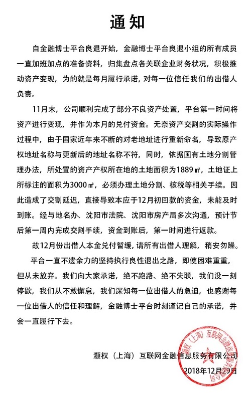 金融博士 2018.12.29-13:47……12月份出借人本金兑付因故暂缓,请稍安勿躁
