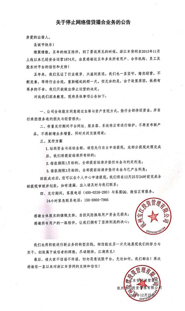 浙江车贷网 2018.12.25-13:18……关于停止网络借贷撮合业务的公告……缘聚缘散,五年相伴,到了要说再见的时候
