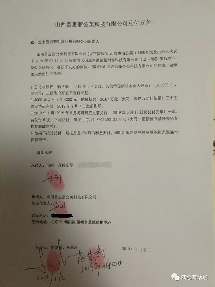 爱钱帮 2019.1.2-20:46……出借人代表与蒲公英邢总沟通兑付方案,经过近3个小时的沟通,最终定下方案为4000以内在2019年1月7日兑付,其他金额5.5个月内平均兑付完毕