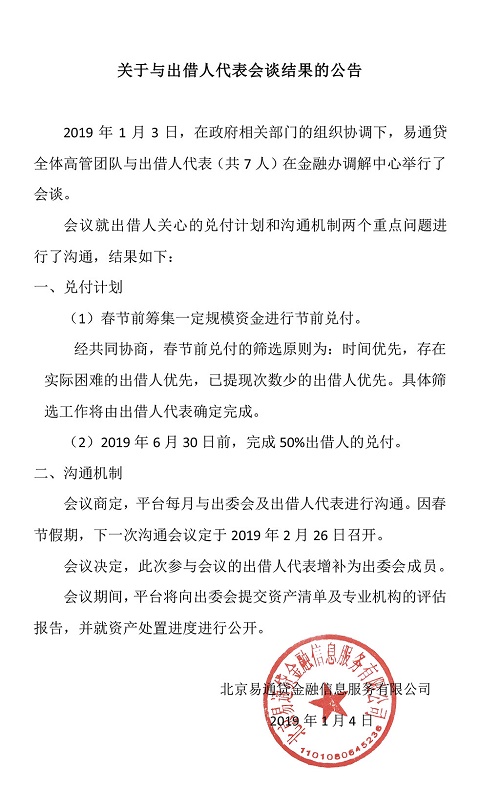 易通贷 2019.1.4-10:15……关于与出借人代表2019.1.3会谈结果的公告