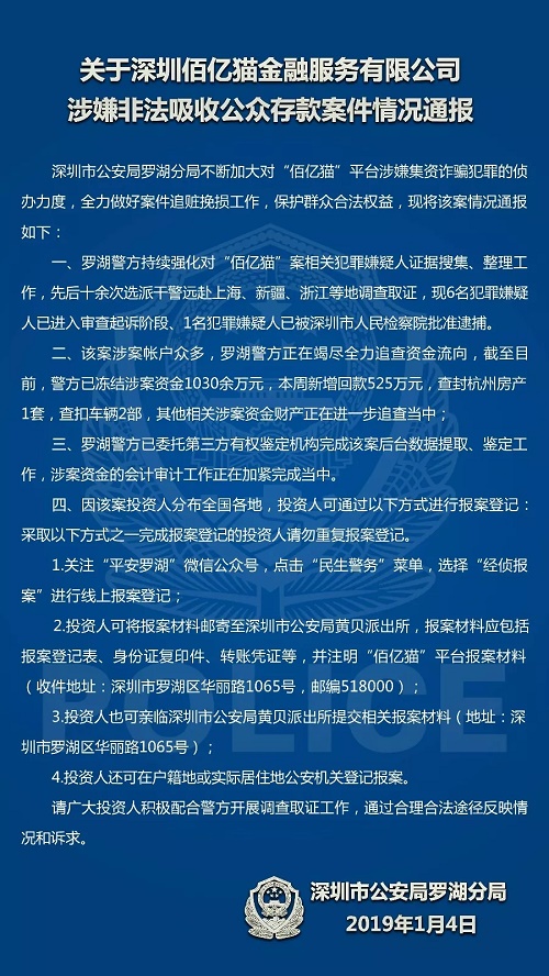 佰亿猫 2019.1.4-18:11……关于深圳佰亿猫金融服务有限公司涉嫌非法吸收公众存款案件情况通报……6名犯罪嫌疑人已进入审查起诉阶段,1名犯罪嫌疑人已被深圳市人民检察院批准逮捕