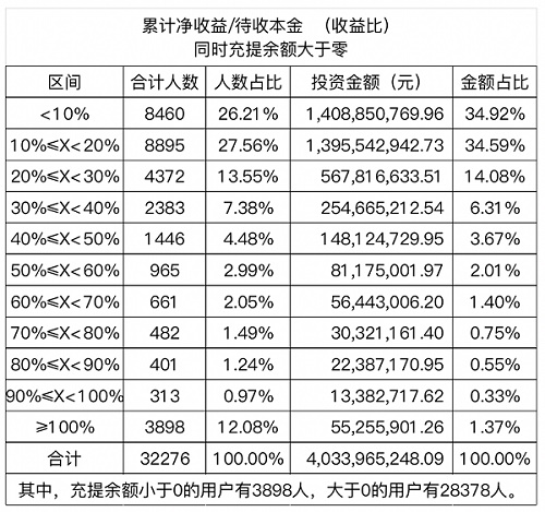 2、 账户待收本金已经提走只有未偿还收益人数:3883人,占所有出借人总数的12%;