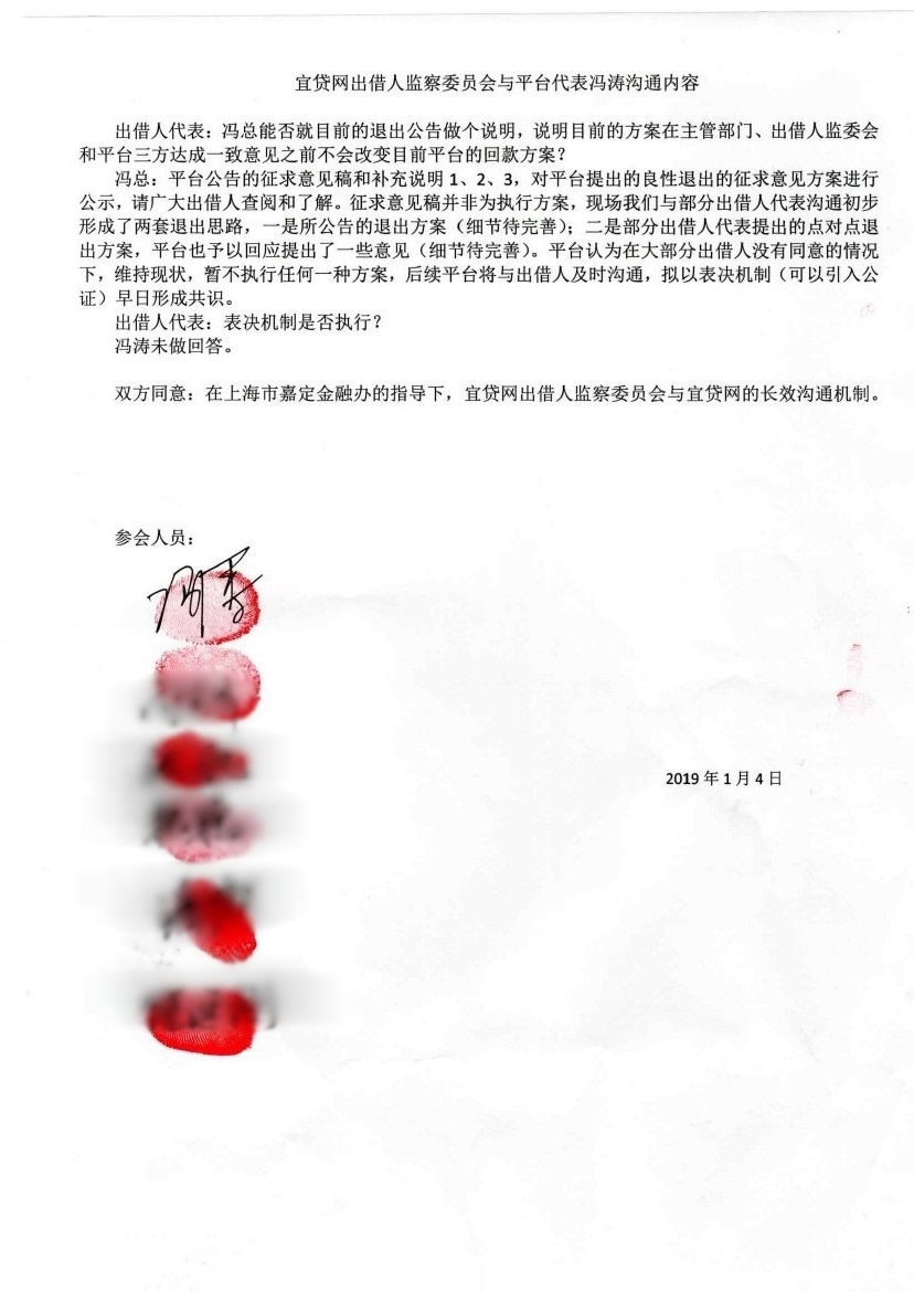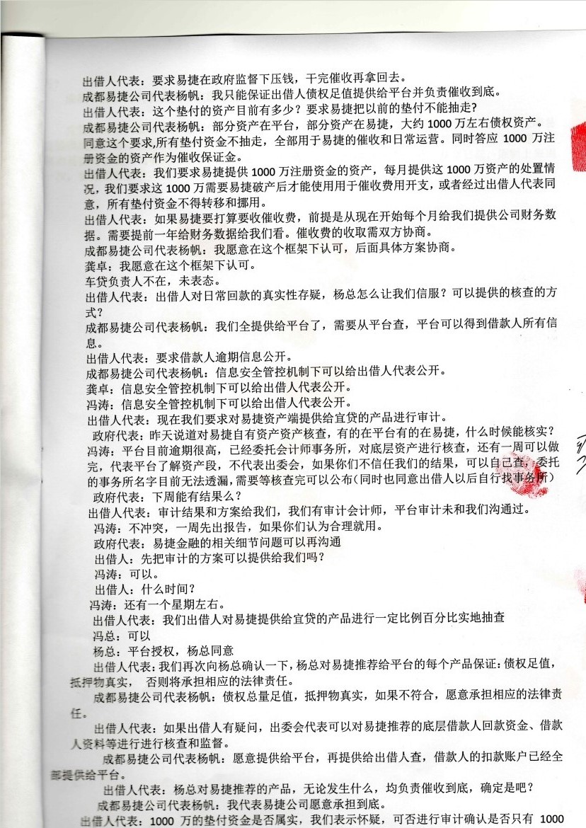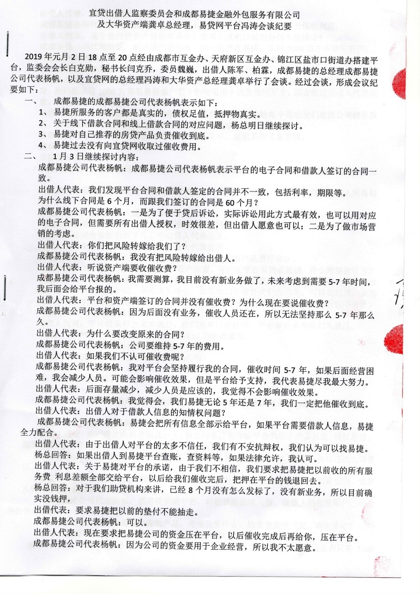 宜贷网 2019.1.4-21:51……宜贷出借人监察委员会与易贷网平台冯涛总经理、成都易捷金融外包服务有限公司、大华资产端龚卓总经理会谈纪要
