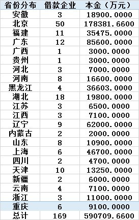 截至2019年1月8日18:00,法务组已完成平台提供的全部资料审核,借款合同有效,借款流水完整的企业为169家,合计本金59.07亿,另有详细分布见下图: