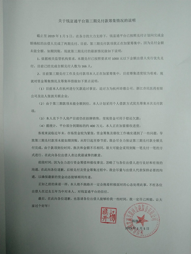 钱富通 2019.1.5-17:46……关于钱富通平台第三期兑付款筹集情况的说明
