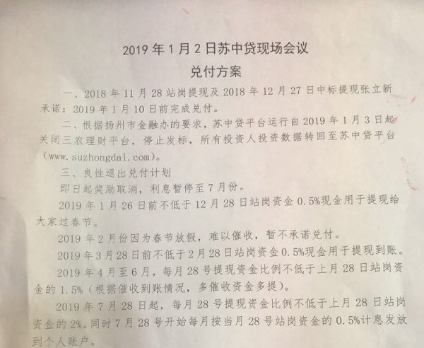 苏中贷 2019.1.3-17:48……苏中贷平台根据目前自身情况,无法完成监管要求。经过公司审慎考虑,本着为所有投资人资金负责的态度,决定即日起,苏中贷平台停止运营、清盘退出