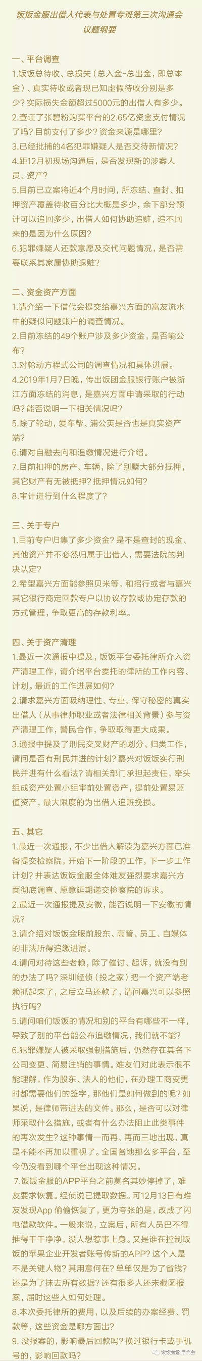 饭饭金服 2019.1.13-23:22……三九天,寒风凛冽,对于我们饭饭难友来说,今年的冬天格外的冷。在此感谢现场代表,不辞辛苦排除万难,你们的付出,让我们感到了温暖……本次沟通会议题的纲要公布
