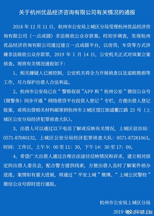 2018年12月11日,杭州市公安局上城区分局受理杭州优品经济咨询有限公司(一点成圆)非法吸收公众存款案。经初步调查,发现杭州优品经济咨询有限公司通过建立一点成圆平台,以房贷、车贷等方式涉嫌非法吸收公众存款罪,2019年1月14日,公安机关正式对该案立案侦查。现将有关情况通报如下: