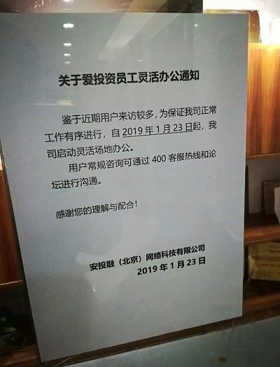 据前线爱投资难友发回的照片,“爱投资”已经找不到固定办公场所,找不到具体负责人,并在通知中表示“启动灵活场地办公”。