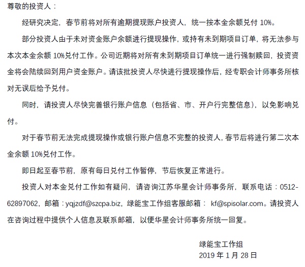绿能宝 2019.1.28-16:37……“绿能宝”公告称将自2019年1月8日起暂停原有每日兑付工作,节后恢复正常。将在春节前对所有逾期提现账户投资人,统一按本金余额兑付10%