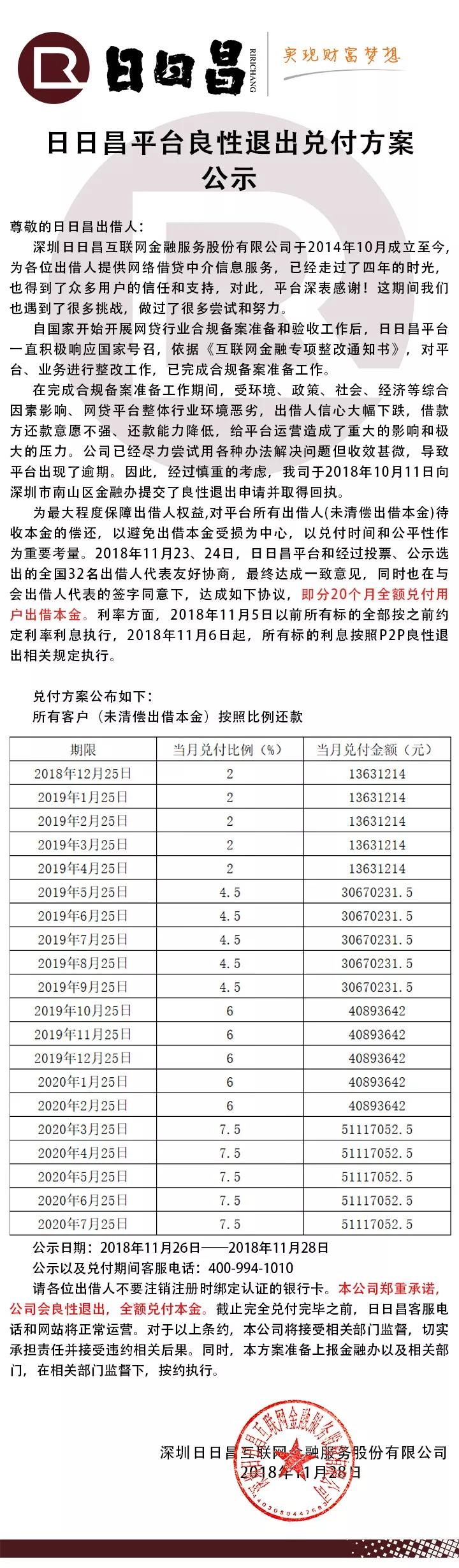 日日昌 2018.11.29-9:23……日日昌平台良性退出兑付方案公示
