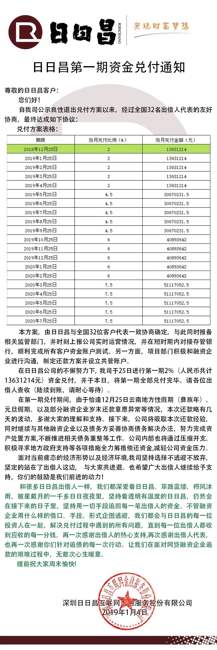日日昌 2019.1.4-15:51……日日昌第一期资金兑付通知……和很多日日昌出借人一样,我们都深爱着日日昌。筚路蓝缕、栉风沐雨、披星戴月的一千多日日夜夜里,坚持着透明有温度的日日昌,仍然会在接下来的日子里,坚持用一切手段追回每一笔出借人的资金。不管融资企业用什么样的借口、手段、形式企图逃避,我们都会与日日昌的每一位投资人在一起,解决兑付过程中遇到的所有问题,直到每一位出借人都收到应收的每一分钱
