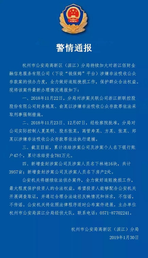 钱保姆 2019.1.30-18:00……杭州市公安局高新区(滨江)分局持续加大对浙江佰财金融信息服务有限公司(下设钱保姆平台)涉嫌非法吸收公众存款案的侦办力度……2018年11月22日分局对涉案关联公司浙江新联控股股份有限公司财务姚某、俞某以涉嫌非法吸收公众存款罪依法采取刑事强制措施;分局对公司实际控制人夏某明、股东张某,高管寿某、张某、方某、郑某以涉嫌非法吸收公众存款罪依法执行逮捕