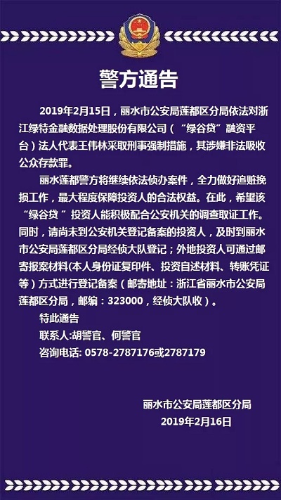 丽水莲都警方关于侦办“绿谷贷”融资平台案件进展情况的通告