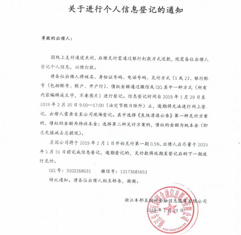 车邦贷 2019.2.19-18:02……关于进行个人信息登记的通知。第一期兑付0.5%