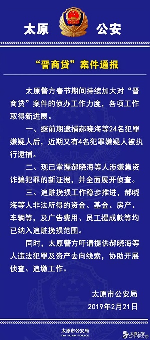 晋商贷 2019.2.21-17:58……“晋商贷”案件通报……现已掌握郝晓海等人涉嫌集资诈骗犯罪的新证据,并全面展开侦查。追赃挽损工作稳步推进,郝晓海等人非法所得的资金、基金、房产、车辆等,及广告费用、员工提成款等均已纳入追赃挽损范围