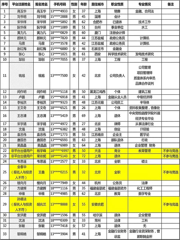 现将所有报名信息进行公示,其中不符合条件者将不参与后续竞选环节(详见以下表格备注),请您知悉。如有疑问可拨打4008851100咨询。