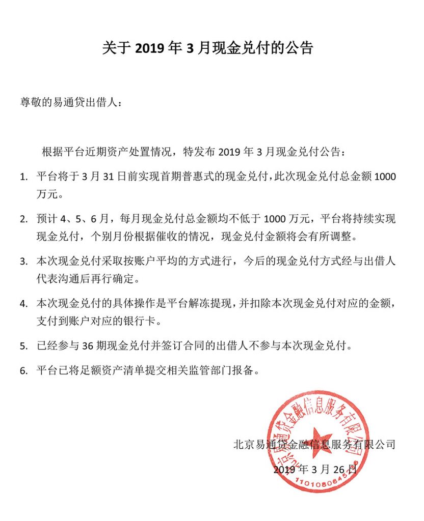 易通贷 2019.3.26-17:01……关于2019年3月现金兑付的公告