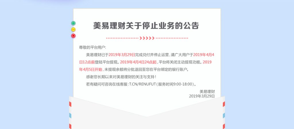 美易理财 2019.3.29-16:42……美易理财已于2019年3月29日完成兑付并停止运营,请投资人于2019年4月4日12点前登陆平台提现。2019年4月4日24点起,平台将关闭主动提现功能。未提现余额,4月5日起,将分批退回至投资人绑定的银行账户