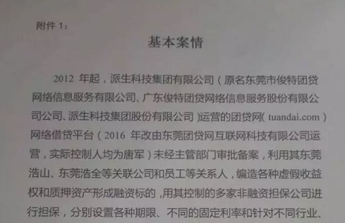 2012年起,派生科技集团有限公司(原名东莞市俊特团贷网络信息服务有限公司、广东俊特团贷网络信息服务股份有限公司、派生科技集团股份有限公司)运营的团贷网(tuandai.com)网络借贷平台(2016年改由东莞团贷网互联网科技有限公司运营,实际控制人均为唐军)未经主管部门审批备案,利用其东莞浩山、东莞浩全等关联公司和员工等关系人,编造各种虚假收益权和质押资产形成融资标的,用其控制的多家非融资性担保公司进行担保,分别设置各种期限、不同的固定利率和针对不同行业、不同人群的各种理财产品38个,通过团贷网线上推广和各地的广东俊特团贷网络信息服务股份有限公司的分公司,以及后来的广东鸿特信息咨询有限公司和广东鸿特普惠信息服务有限公司(两公司登记地址已搬迁到深圳)的514家分公司线下推广等方式,在平台上公开销售理财产品。投资人在团贷网购买相关理财产品后,投资款项转入相应的多个第三方支付结算机构账户(包括2017年3月后的厦门银行监管账户)累计吸收投资款项1500亿元,截止目前仍有待偿人数32万多人,待偿金额超过396亿元,涉嫌非法吸收公众存款罪。其中: