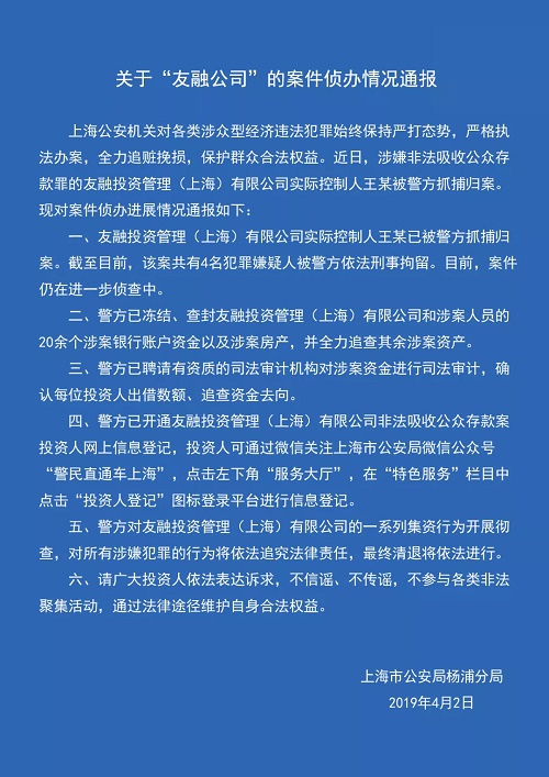 友融投资 2019.4.2-16:39……关于“友融公司”的案件侦办情况通报
