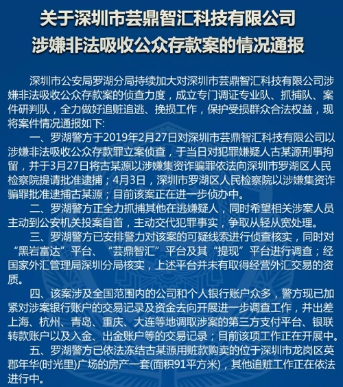 关于深圳市芸鼎智汇科技有限公司涉嫌非法吸收公众存款案件的情况通报