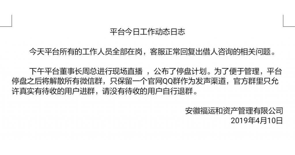 房易贷 2019.4.10-18:01……合肥房易贷平台老板周道广直播宣布平台停盘,公布停盘计划