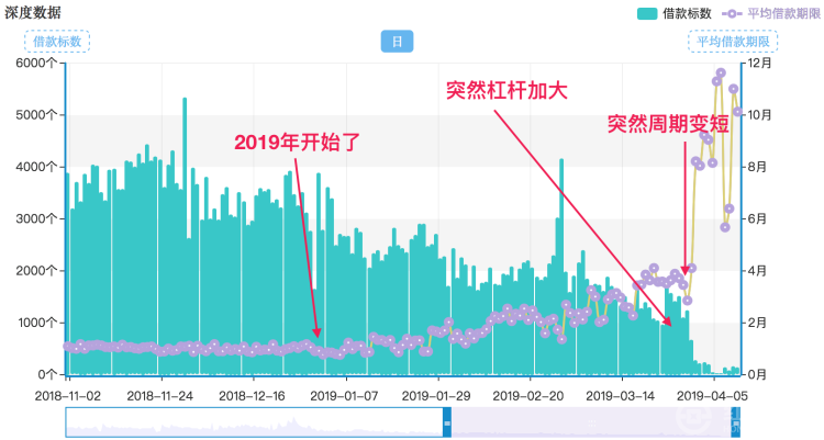 1、一直到2019年1月1日之前,这跟线都是平稳的,平均借款期限是一个月,但是借款金额在稳步下降。说明杠杆在降,但是净值借款的绝大部分是一个月期限。