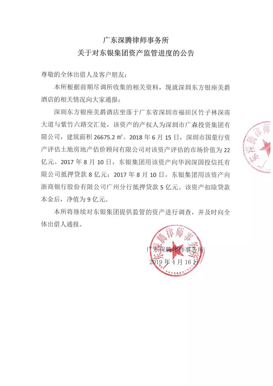 广东深腾律师事务所关于对东银集团资产监管进度的公告