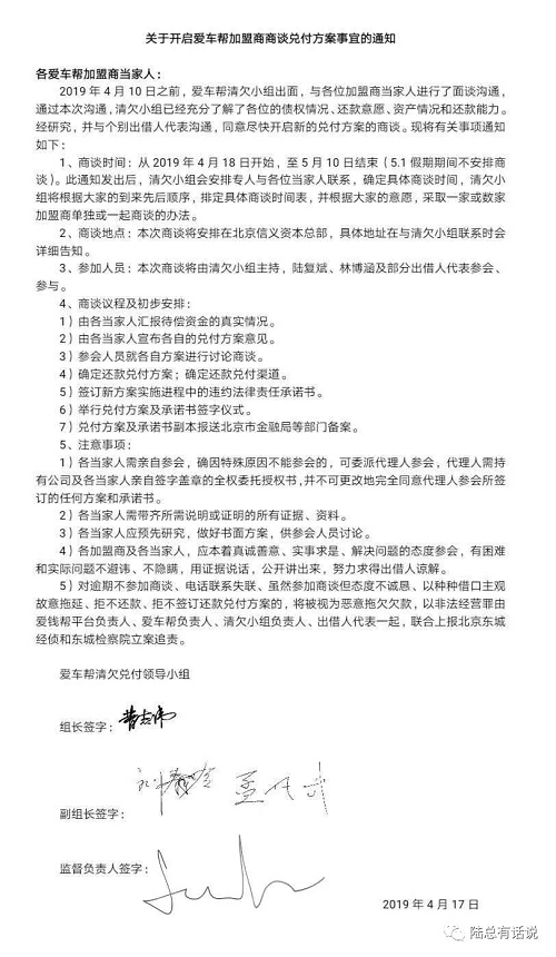 爱钱帮 2019.4.17-19:40……关于开启爱车帮加盟商商谈兑付方案事宜的通知