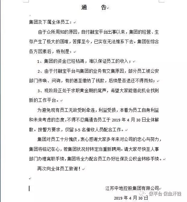 付融宝 2019.5.1-0:02……由于众所周知的原因,自付融宝平台出事以来,(江苏中地控股)集团的经营、生存产生了极大的困难,苦撑至今,已实在无法维系下去。为避免现有员工无故受到牵连,利益受损,不得不忍痛通告员工于2019年4月30日全体解散