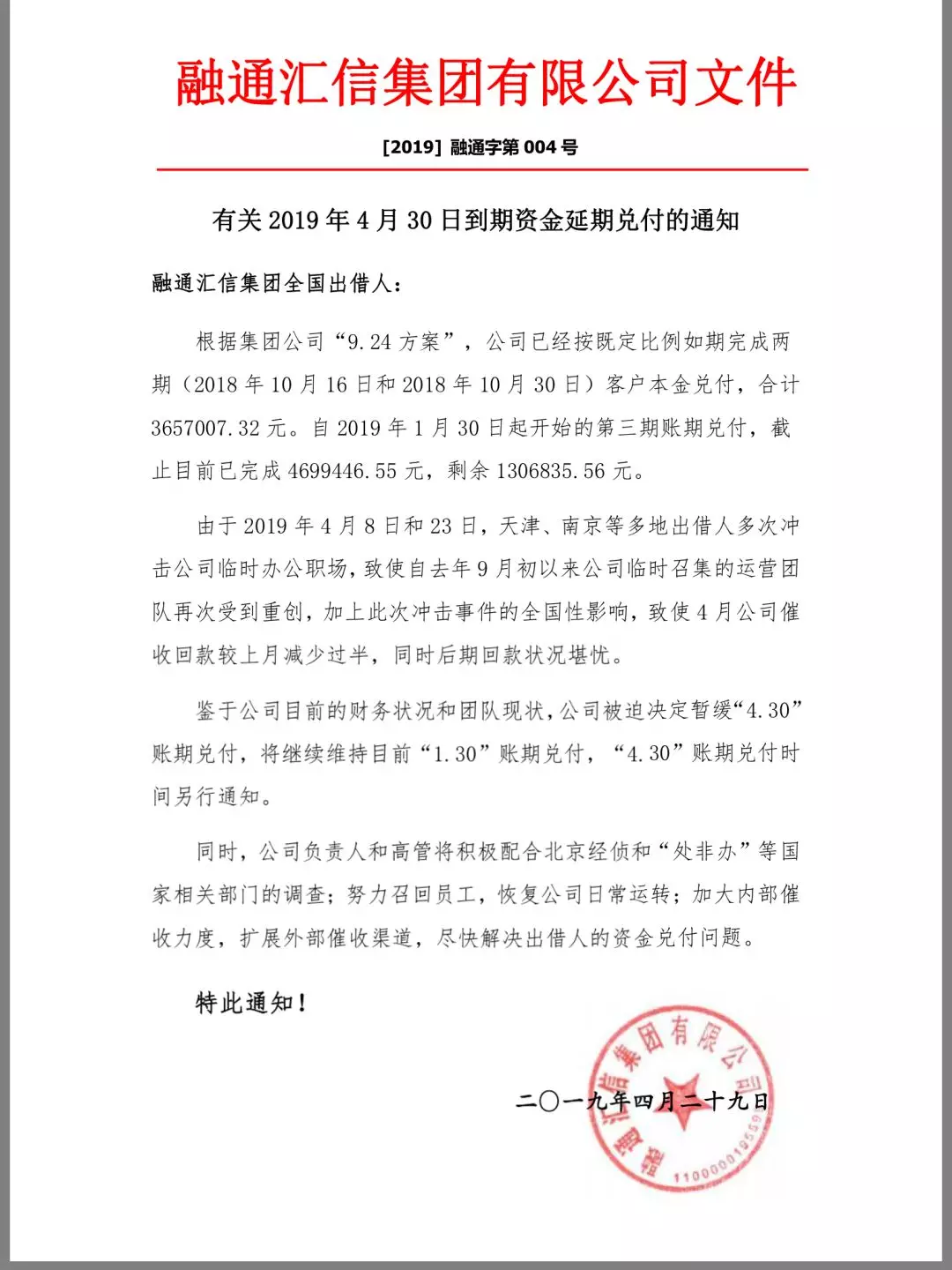 融通汇信 2019.4.29-17:00……有关2019年4月30日到期资金延期兑付的通知
